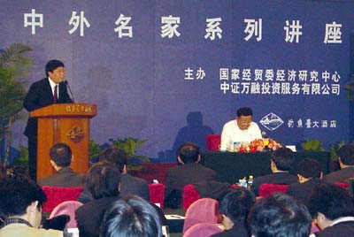 據(jù)了解,“中外名家系列講座”是由國(guó)家經(jīng)貿(mào)委經(jīng)濟(jì)研究中心和中證萬(wàn)融投資服務(wù)有限公司聯(lián)合主辦。自2001年9月起已舉辦了37期(每月2期),受到社會(huì)各界特別是企業(yè)界的廣泛好評(píng)。參加此期講座的嘉賓中,有來(lái)自企業(yè)界的知名人士及各大媒體領(lǐng)導(dǎo)。此期講座由專項(xiàng)部主任支東升主持。