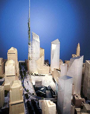 美國建筑師丹尼爾·利貝金斯德準備在紐約世貿(mào)中心廢墟上,興建532.8米的世界最高尖塔大樓的構(gòu)想,26日獲得評選人員的青睞。