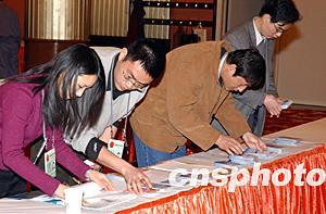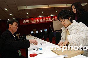 “兩會”新聞中心的工作人員正在為參加“兩會”報道的香港記者辦理采訪證件。估計參加今年全國“兩會”報道的海內(nèi)外記者將近三千人。作者:盛佳鵬
