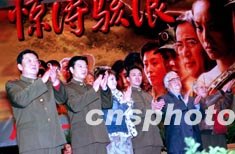 由八一電影制片廠推出的再現(xiàn)1998年全國軍民與大洪水英勇抗?fàn)幍拇笮碗娪肮适缕扼@濤駭浪》首映式,28日在北京人民大會(huì)堂隆重舉行。圖為影片主要演員于洋、巫剛、寧靜等在首映式上與觀眾見面。作者:張勤