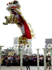 黃飛鴻獅藝武術(shù)隊三月初在廣州為市民進(jìn)行醒獅表演,以紀(jì)念一代宗師黃飛鴻在廣州西關(guān)設(shè)館一百四十周年。作者:劉衛(wèi)勇