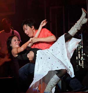 李心潔當(dāng)晚和好友阿牛的“親密”演出掀起全場高潮,為了阿牛,李心潔又是伴舞又是陪唱,更破例在臺上演唱廣東歌《失戀好煩》,雖然只是和音,但她和阿牛的“阿哥哥”舞就叫大家忍不住HIGH起來,最后心潔更把右腳踩在阿牛的左大腿上,讓阿牛驚呼∶“李心潔,終于踩對地方了!大家知不知道她彩排時常踩錯地方!”臺下一陣爆笑!