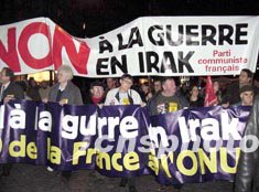 法國巴黎五日再度舉行反戰(zhàn)示威游行。數(shù)以千計的青年學生、左派人士走上街頭,高呼“要和平,不要戰(zhàn)爭”的口號,反對美國出兵攻打伊拉克。圖為由法共組織的游行隊伍在夜色中行進。作者:蔚中