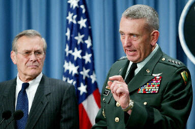 3月5日,在美國華盛頓五角大樓,美國國防部長拉姆斯菲爾德(左)和美國中央司令部司令弗蘭克斯出席記者招待會(huì)。弗蘭克斯說,美軍目前已經(jīng)為對伊拉克采取軍事行動(dòng)作好了準(zhǔn)備。