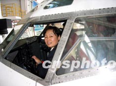 中國(guó)海南航空公司第一位女機(jī)長(zhǎng)丁華榮駕駛飛機(jī)準(zhǔn)備升空。作者:黃葵