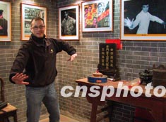 加拿大楓葉尋根之旅的華裔青年十日來到廣東順德杏壇右灘村尋根,營員鄭國棟在李小龍祖居擺姿勢留影。作者:羅仰明