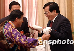 全場(chǎng)穿得最“靚”的青海省海南藏族自治州州長公保尚,說著說著便拿出“哈達(dá)”獻(xiàn)給曾慶紅,表達(dá)對(duì)黨中央的謝意。曾慶紅笑著站起來,連迎兩步,雙手接過,連聲說“謝謝!”