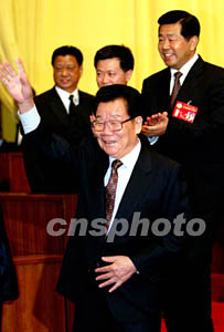 全國(guó)政協(xié)十屆一次會(huì)議第四次全體會(huì)議十三日舉行,會(huì)議將選舉出全國(guó)政協(xié)新一屆領(lǐng)導(dǎo)人。李瑞環(huán)、賈慶林一同步入會(huì)場(chǎng)。作者:鄭萍萍