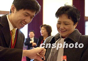 全國政協(xié)十屆一次會議閉幕大會十四在京舉行。全國政協(xié)委員、鄧小平之女鄧楠在會前為工作人員簽名留念。作者:廖文靜