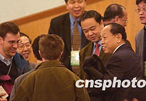 在三月十七日舉行的十屆全國人大一次會議第七次全體會議上,李肇星獲任外交部長后,外國記者紛紛上前表示祝賀。作者:張煒