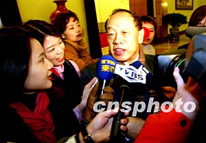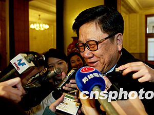 交通部部長張春賢三月十七日出席十屆全國人大一次會議時接受中外記者采訪。作者:張煒