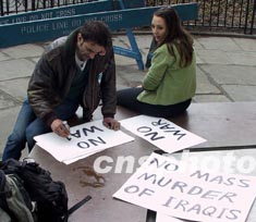 三月十七日在聯(lián)合國安理會為避免戰(zhàn)爭竭盡所能之時(shí),守候在聯(lián)合國大樓外的反戰(zhàn)者書寫反戰(zhàn)標(biāo)語,為阻止戰(zhàn)爭做最后努力。作者:趙海燕