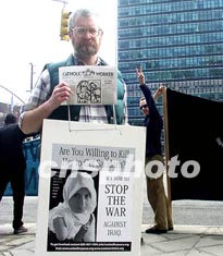 當(dāng)?shù)貢r(shí)間三月十七日上午,聯(lián)合國內(nèi)伊拉克問題上的外交斗爭正式結(jié)束。美、英、西宣布,放棄在安理會上對伊拉克最后通牒議案進(jìn)行表決的努力。在聯(lián)合國總部門前,一名反戰(zhàn)者身掛伊拉克殘疾少女畫像的表語牌,上書:“為抓住薩達(dá)姆,你想殺死她嗎”?作者:陳