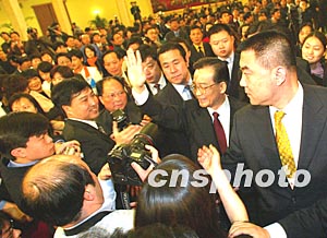 十屆全國(guó)人大一次會(huì)議十八日在北京人民大會(huì)堂閉幕,溫家寶在記者招待會(huì)后,欣然走下臺(tái)與記者們打招呼,引起現(xiàn)場(chǎng)混亂。作者:毛建軍