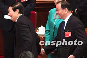 十屆全國(guó)人大一次會(huì)議三月十八日閉幕后,王樂(lè)泉代表握住朱镕基的手久久不愿放開(kāi)。作者:張煒