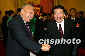 十屆人大一次會議十八日上午在北京人民大會堂閉幕,出席會議的香港特別行政區(qū)行政長官董建華與前總理朱镕基話別。作者:毛建軍