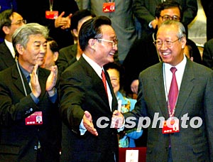 吳邦國委員長十八日下午在北京人民大會堂會見出席十屆人大一次會議的港澳代表,圖為吳邦國與澳門代表賀一誠握手。作者:毛建軍