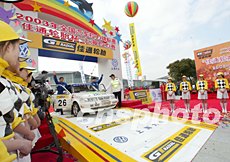 中國臺北車手林志穎作為佳通輪胎形象代言人,參加2003年中國汽車?yán)惿虾U颈荣。?2日發(fā)車儀式上,由上海靚女陪伴準(zhǔn)備發(fā)車。作者:趙振清