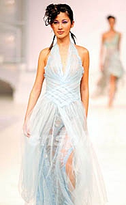 香港時裝精選《今夜星光燦爛》二十四日晚在北京中國大飯店成功舉行,十一位香港著名設(shè)計師的作品集體亮相,為二零零三年中國國際時裝周首日表演增添絢麗色彩。圖為楊遠(yuǎn)振表現(xiàn)女性優(yōu)雅氣質(zhì)的紗質(zhì)禮服系列。作者:毛建軍
