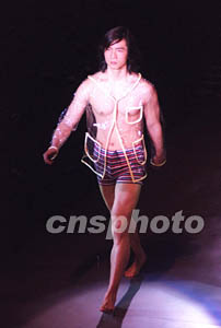 三月二十六日,有“今日青年潮流指標(biāo)”之稱的卡賓服飾在北京電影制片廠攝影棚內(nèi)舉行時尚男裝秀,欲以別致的舞臺效果掀起全新時尚風(fēng)暴。圖為卡賓演繹透明男裝。作者:武仲林