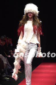 二00三年東京秋冬時裝展二十六日晚拉開帷幕,在近一個月的展期中,日本時裝設(shè)計師們將發(fā)表五十多個品牌的新作品。圖為設(shè)計師白浜利司子二十六日晚率先發(fā)表她的羊毛作品。作者:陶光雄