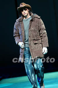 三月二十七日,馬克·華菲03/04秋冬時裝發(fā)布會在北京舉行,模特展示一款充滿西部風(fēng)情的時裝,體現(xiàn)了設(shè)計師大膽的想象力。作者:盛佳鵬