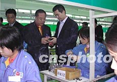 泰國華人青年商會潮汕地區(qū)經(jīng)濟(jì)文化訪問團(tuán)三月二十八日在廣東汕頭參觀奧迪玩具實業(yè)有限公司。該公司總經(jīng)理蔡東青(后左三)向訪問團(tuán)團(tuán)長李桂雄(后左二)介紹情況。作者:王惠存