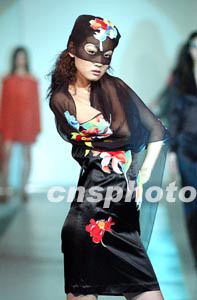 三月二十八日晚,“愛(ài)美”時(shí)裝在北京昆侖飯店舉行春夏時(shí)裝流行趨勢(shì)發(fā)布會(huì),一名戴面具的模特展示一款性感時(shí)裝。作者:盛佳鵬
