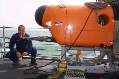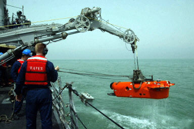 30日,美軍艦“掠奪”號(hào)使用水雷壓制裝置在伊拉克南部烏姆蓋斯?fàn)査驁?zhí)行掃雷任務(wù)。