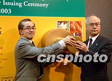 香港郵政4月4日發(fā)行紀(jì)念封,紀(jì)念香港郵政參與由香港郵學(xué)會主辦的香港郵展2003。圖為香港郵政副署長曾國林及香港郵學(xué)會張文德醫(yī)生在紀(jì)念封上蓋印。作者:洪少葵