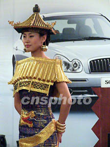 北京一家汽車俱樂部在四月春日請身穿仿中國宮廷建筑服飾的時(shí)裝模特,以服飾的華麗高貴為新興的時(shí)尚汽車生活助興。作者:王麗南