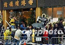 已故歌星張國(guó)榮設(shè)在香港殯儀館的靈堂于四月七日傍晚6時(shí)至8時(shí)開放,眾多記者冒雨匯集殯儀館采訪。錢興強(qiáng) 攝