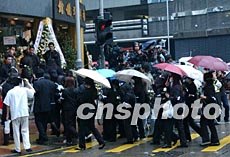 已故歌星張國(guó)榮設(shè)在香港殯儀館的靈堂于四月七日傍晚6時(shí)至8時(shí)開放,眾多歌迷冒雨前來(lái)致祭。錢興強(qiáng) 攝