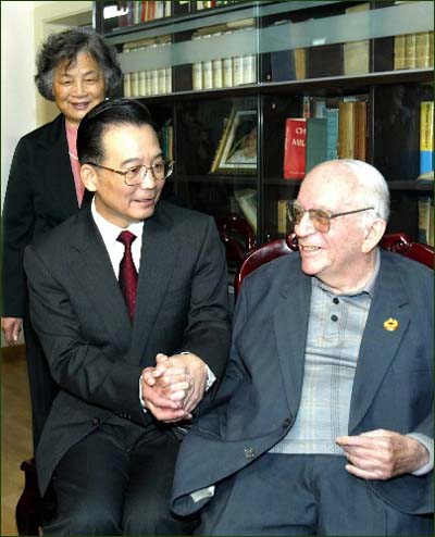 中新網(wǎng)4月20日電 中共中央政治局常委、國(guó)務(wù)院總理溫家寶20日上午來到全國(guó)政協(xié)常委、外國(guó)老專家愛潑斯坦寓所,親切看望了愛潑斯坦同志,并代表黨中央、國(guó)務(wù)院祝賀他在華工作70年暨88壽辰。