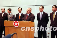 香港特首董建華連同政府高官,4月23日在政府總部宣布將推出118億港元的八項救市措施,紓緩SARS疫情對本港經濟的影響。中新社傳真 洪少葵 攝