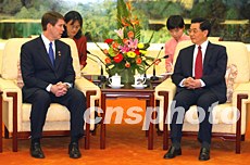 四月二十一日,中國國家主席胡錦濤在人民大會堂會見由參議院多數(shù)黨領(lǐng)袖比爾·弗里斯特率領(lǐng)的美國參議院訪華代表團(tuán)。