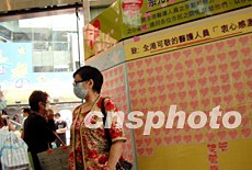 香港一購物商場特設(shè)顧客心意咭,感謝為對抗非典型肺炎的醫(yī)護人員。據(jù)醫(yī)管局26日公布,首次有醫(yī)護人員在照顧SARS病人時受到感染而殉職。洪少葵 攝