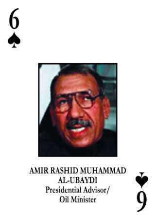 美軍方29日稱,他們已扣押了薩達姆政府的石油部長阿米爾·穆罕默德·拉施德。拉施德在美軍通緝撲克中排名47,是黑桃六。他是美軍已宣布拘捕的第14名伊拉克高層官員。(路透)