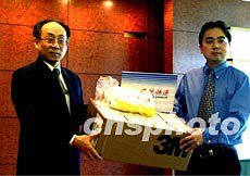 美國(guó)紐約哥倫比亞大學(xué)中國(guó)學(xué)生學(xué)者聯(lián)誼會(huì)購(gòu)買(mǎi)了五千只世界衛(wèi)生組織推薦的N九五防護(hù)口罩,贈(zèng)送給戰(zhàn)斗在抗擊非典型肺炎第一線的中國(guó)醫(yī)務(wù)工作者。二十九日哥大學(xué)生代表將口罩樣品和捐贈(zèng)清單交給中國(guó)駐紐約總領(lǐng)事張宏喜(左)。作者:趙海燕