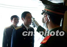 解放軍接管的北京小湯山野戰(zhàn)非典定點醫(yī)院五月一日封閉進入臨戰(zhàn)狀態(tài),警衛(wèi)士兵對進入參戰(zhàn)的高級軍官嚴格檢查體溫。作者:賈國榮