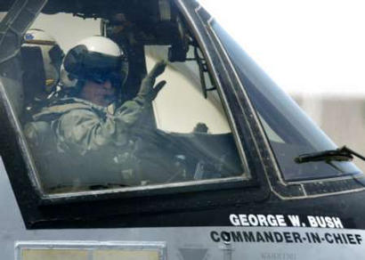 美國(guó)總統(tǒng)布什年輕時(shí)曾經(jīng)擔(dān)任得克薩斯州國(guó)民警衛(wèi)隊(duì)?wèi)?zhàn)斗機(jī)飛行員,但自從入主白宮后,這位“戰(zhàn)爭(zhēng)總統(tǒng)”根本沒(méi)機(jī)會(huì)過(guò)把駕機(jī)癮。每次出遠(yuǎn)門,總是先從白宮乘“海軍陸戰(zhàn)隊(duì)一號(hào)”直升機(jī)抵達(dá)機(jī)場(chǎng),然后轉(zhuǎn)乘“空軍一號(hào)”專機(jī)。1日,為前往美“林肯號(hào)”航空母艦發(fā)表有關(guān)伊拉克戰(zhàn)爭(zhēng)結(jié)束的講話,同時(shí)鼓舞士氣,這位總統(tǒng)竟然提出要乘坐F-18型雙座教練機(jī)從圣迭哥飛行數(shù)百公里降落在航空母艦甲板上,然后在當(dāng)天晚上9點(diǎn)(北京時(shí)間2日上午9點(diǎn))發(fā)表全國(guó)講話,宣布伊拉克境內(nèi)戰(zhàn)斗“基本結(jié)束”,但是“不達(dá)最終目的,美軍絕不收兵”。