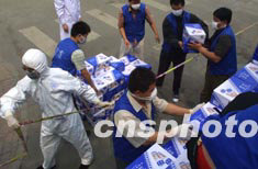 五月六日,社會各界捐贈給醫(yī)護人員的大批物品運抵被隔離的北京人民醫(yī)院。中新社記者:史利