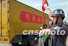 中央政府支援香港抗炎醫(yī)用物品交接儀式,五月八日在深圳皇崗口岸舉行, 滿載著抗炎物品的八輛集裝箱車從深圳皇崗口岸出發(fā)運抵香港。中新社記者 錢興強 攝