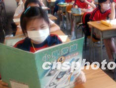 隨著香港“SARS”疫情的逐漸穩(wěn)定,香港數百所小學的高年級學生五月十二日開始復課。在灣仔學校復課的第一天,老師向學生提問有關如何防預“SARS”的基本知識。中新社記者 錢興強 攝