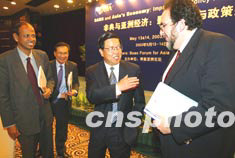 博鰲亞洲論壇SARS與亞洲經(jīng)濟--影響評估與政策建議研討會十四日在北京結(jié)束,博鰲亞洲論壇秘書長龍永圖(右二)與出席會議的華爾街日報中國社長高賦文(右一)、馬來西亞駐華大使馬吉德等交談。中新社記者:毛建軍