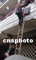 雙清區(qū)環(huán)衛(wèi)局領(lǐng)導用梯子將困在二樓的群眾接上船