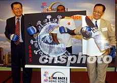 香港推出“吃喝玩樂(lè)Come Back Hong Kong”運(yùn)動(dòng)。“吃喝玩樂(lè)Come Back Hong Kong”運(yùn)動(dòng)五月十九日在香港展開(kāi),其旨在鼓勵(lì)香港市民拋開(kāi)對(duì)非典型肺炎疫情的憂慮,重新投入積極的生活。圖為香港總商會(huì)總裁翁以登(左)、香港餐飲聯(lián)業(yè)協(xié)會(huì)會(huì)長(zhǎng)伍德良(右)等擊打“SARS病毒”從而為該活動(dòng)揭幕。中新社記者:潘索菲