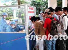 高考臨近,海南省在口岸設(shè)立接待處,對在外借讀返瓊的考生進行嚴格檢查,以防輸入性“非典”進入海南。作者:李建國