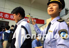 在SARS陰霾尚未完全散去的復(fù)課首日,北京各學(xué)校大多作足了“戒炎”功夫。記者今晨在北京八中看到,一大塊綠色消毒毯已在校園門(mén)口鋪展開(kāi),四臺(tái)紅外線體溫測(cè)試儀亦“嚴(yán)陣以待”。