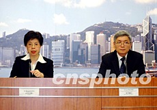 香港衛(wèi)生署長陳馮富珍及醫(yī)院管理局行政經(jīng)理劉少懷,5月22日在記者會公布新增3宗SARS個案,當(dāng)中沒有醫(yī)護人員,再有3名女病人死亡。另外有10名康復(fù)者出院,香港至今已連續(xù)7天錄得少于5個SARS感染病例。洪少葵 攝